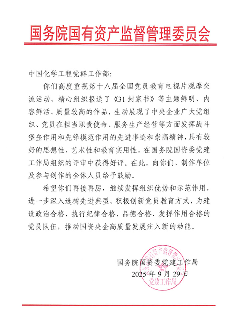 近日,由中國(guó)化學(xué)工程第三建設(shè)有限公司原創(chuàng)的黨員教育片《31封家書(shū)》再傳捷報(bào)!該作品經(jīng)中國(guó)化學(xué)工程集團(tuán)有限公司黨委推薦,參與中央組織部第十八屆全國(guó)黨員教育電視片觀摩交流活動(dòng),并獲得國(guó)務(wù)院國(guó)資委黨委的高度評(píng)價(jià),專(zhuān)門(mén)發(fā)來(lái)鼓勵(lì)函予以表彰。這一榮譽(yù)不僅是對(duì)作品藝術(shù)價(jià)值的肯定,更是對(duì)中國(guó)化學(xué)三化建人“家國(guó)情懷”與“硬核擔(dān)當(dāng)”的生動(dòng)詮釋。