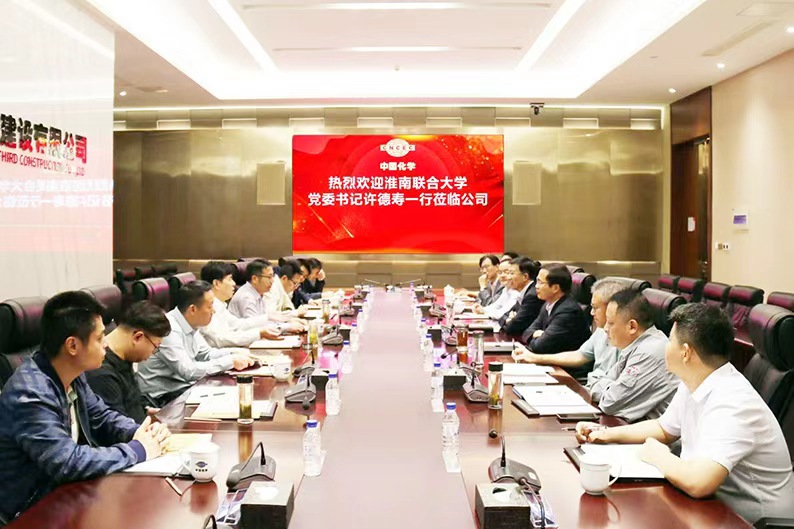 10月11日,中國化學工程第三建設有限公司黨委書記、董事長占德慶在合肥總部會見淮南聯合大學黨委書記許德壽,黨委副書記、副校長劉銀一行,雙方就深化校企合作進行了深入溝通交流。