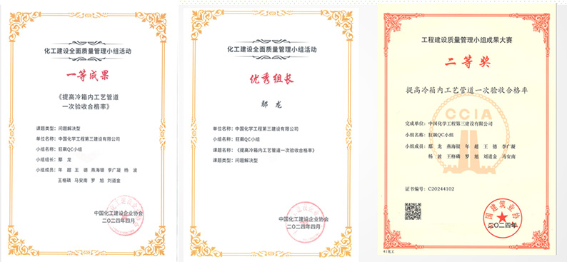 此后,“提高冷箱內工藝管道一次驗收合格率”課題先后參加了公司級、省部級及國家級競賽,最終榮獲2024年中國建筑業協會工程建設質量管理小組成果大賽“二等獎”,中國化工建設企業協會化工建設全面質量管理小組活動“一等獎”,我也非常榮幸地被評為“優秀組長”。