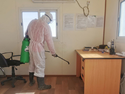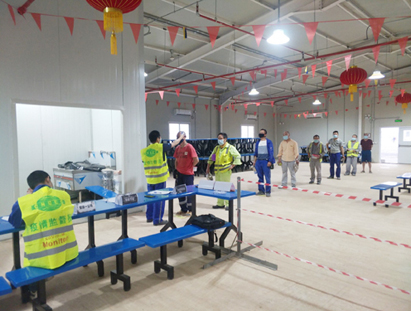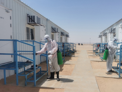 疫情發生以來,沙特哈拉德項目經理部按照集團公司、公司的統一部署,第一時間制定并不斷修訂完善《項目新冠肺炎疫情防控應急預案》,利用QQ群、微信群、線上教育、張貼宣傳畫等形式,將防疫知識宣傳到全體員工,提高全員防疫意識,確保“一米線”和“戴口罩”人人皆知。同時采用給中外員工發放口罩、每日早晚兩次體溫測量全覆蓋;對主辦公室進行封閉管理、錯峰乘車、錯峰就餐;減少項目人員流動、營地封閉管理、業余時間禁止外出;取消堂食、關閉祈禱室、娛樂室、健身房;對營地超市進行限員入內;對現場辦公區、休息棚、廁所、通勤車、營地宿舍、餐廳、公共洗浴間進行每日兩次的全面消殺;每日全員在“化學海外”上報身體狀況;全體中國員工簽訂承諾書;嚴控外籍人員私自外出、流動去大城市等舉措,充分把握疫情防控主動權,全力推進項目建設。