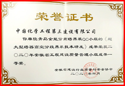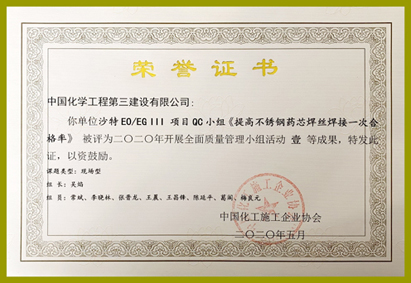 青島分公司金能產品分離塔吊裝QC小組“超重超高大直徑分離塔多段高空吊裝技術研發”QC成果、沙特EO/EG Ⅲ項目QC小組“提高不銹鋼藥芯焊絲焊接一次合格率”QC成果榮獲中國化工施工企業協會“二0二0年全面質量管理小組活動”一等成果。