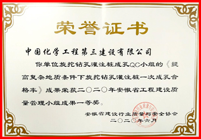 在公司首次參加的安徽省建筑業企業QC小組成果交流大賽中,公司建筑工程三公司旋挖鉆孔灌注樁成孔QC小組“提高復雜地質條件下旋挖鉆孔灌注樁一次成孔合格率”QC成果、青島分公司金能產品分離塔吊裝QC小組“超重超高大直徑分離塔多段高空吊裝技術研發”QC成果榮獲一等獎;電氣儀表工程一公司技術研發中心電氣QC小組“提高密集型插接式母線槽安裝合格率”QC成果榮獲二等獎。