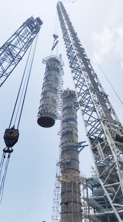 第一粗苯塔整體高87.89m、總重320t,采用750t履帶吊主吊、260t履帶吊溜尾進(jìn)行空中組對焊接。其中,下段130t,中段108t,上段94t。
