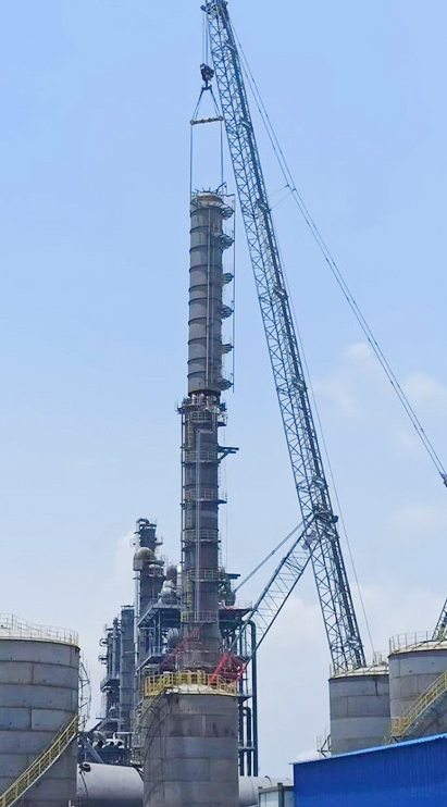 7月5日,隨著第一粗苯塔T403上段的順利吊裝就位,安裝工程十一公司承建的安徽嘉璽科技有限公司35萬噸/年苯乙烯裝置第一粗苯塔完成全部三段吊裝組對焊接任務(wù)。