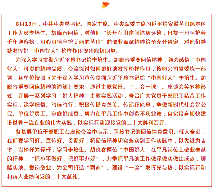 喜迎二十大 匯聚正能量|各單位學習貫徹習近平總書記給“中國好人”李培生胡曉春重要回信精神