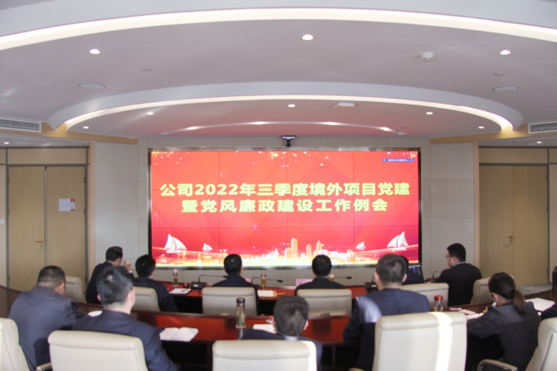 11月9日,公司召開2022年三季度境外項目黨建暨黨風廉政建設工作專題會。公司黨委副書記、工會主席顧士新,紀委書記張建新出席會議,就學習貫徹黨的二十大精神、增強黨組織政治功能和組織功能,進一步做好黨風廉政建設工作分別提出要求。